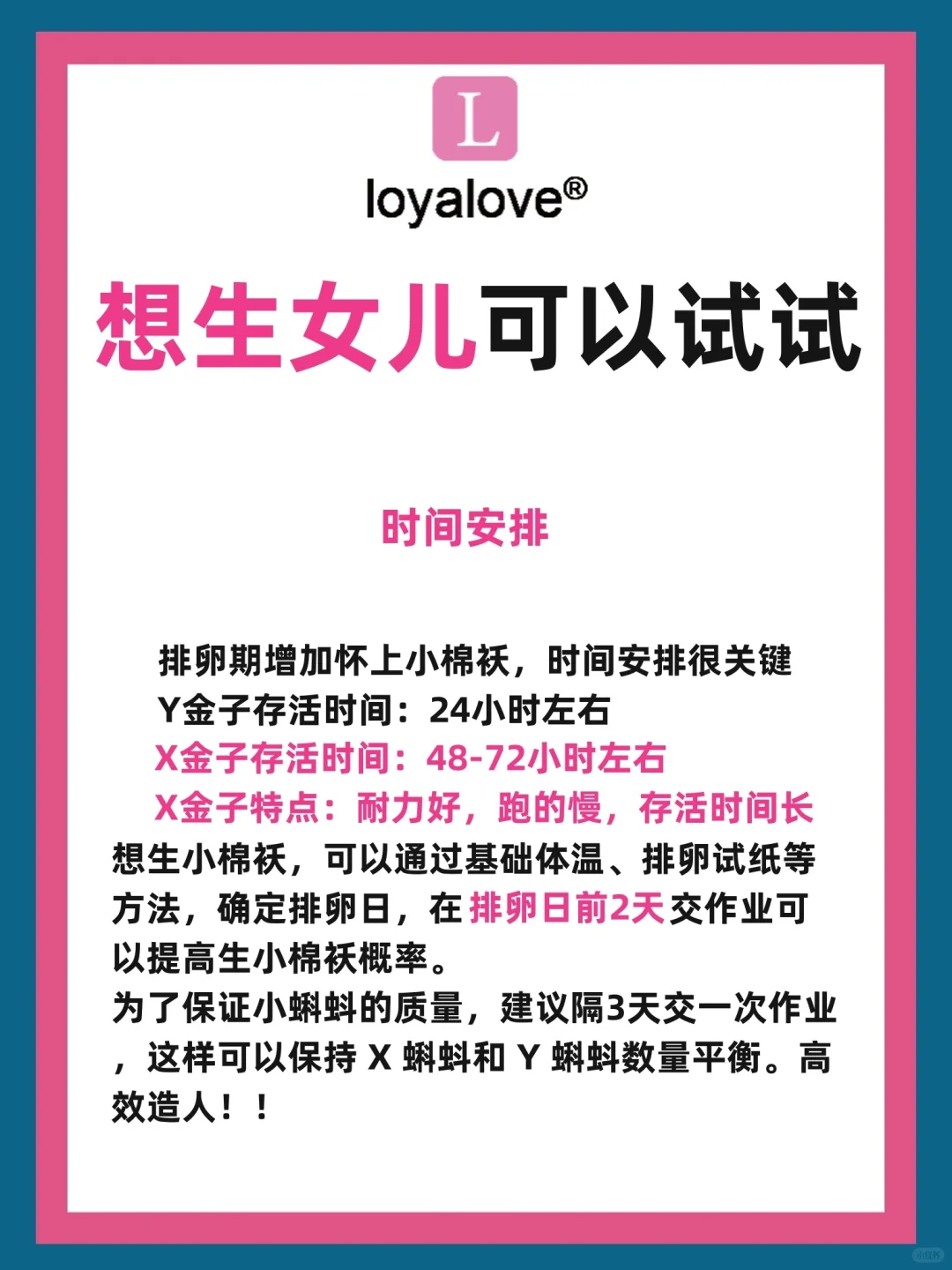 1⃣时间安排很关键排卵期增加怀上小棉袄,时间安排很关键Y 金子存活时间:24小时左右X 金子存活时间:48-72小时左右X 金子特点:耐力好,跑的慢,存活时间长想生小棉袄,可以通过基础体温、排卵试纸等方法!确定排卵日,在排卵日前2-3天交作业可以提高生小棉袄概率,这对于代生和代怀计划很有帮助。为了保...[查看阅读]